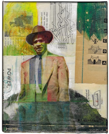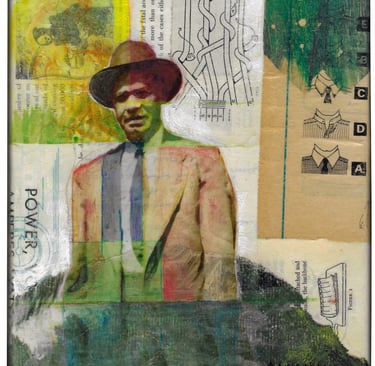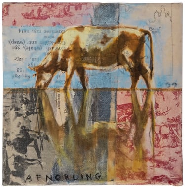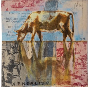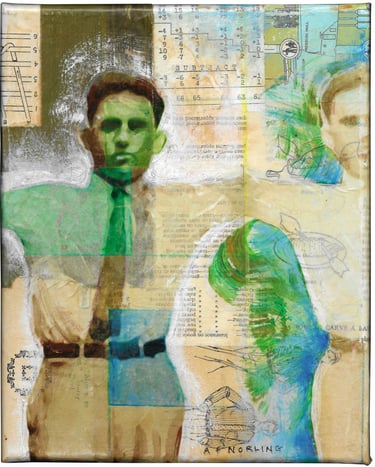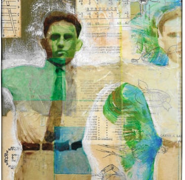 I'm an artist living in coastal Maine. My paintings are a mishmash of vintage/antique paper collage layers and art-making mediums (pencil, pen, acrylics, oils, etc.). I use whatever I think may create the effect I'm looking for at that moment. I often paint over found paintings, always leaving small touches of the original piece sneaking through.